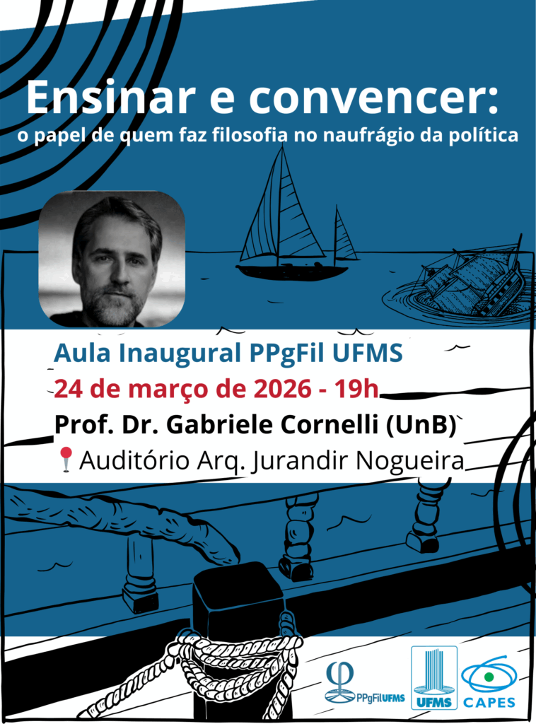 O Programa de Pós-Graduação em Filosofia (PPgFil) da UFMS convida toda a comunidade acadêmica para a sua Aula Inaugural, que será realizada no dia 24 de março, às 19h, no Auditório Arquitetura Jurandir Nogueira.