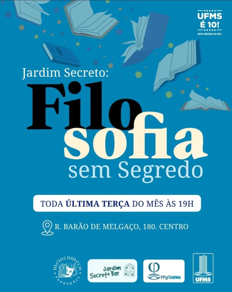 Terá início em 28/10, o Projeto “Jardim Secreto: Filosofia sem segredo”. Trata-se do Projeto de Extensão do PPgFil, em parceria com Jardim Secreto Café Bar. Serão nove (9) sessões públicas de apresentações de temas filosóficos, envolvendo docentes e discentes do PPgFil. Evento aberto a toda a comunidade acadêmica e ao público geral de Campo Grande.