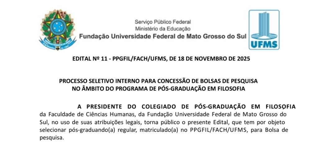 Foi publicado o Edital do Processo Seletivo Interno para Concessão de Bolsas de Pesquisa no Âmbito do Programa de Pós-Graduação em Filosofia.