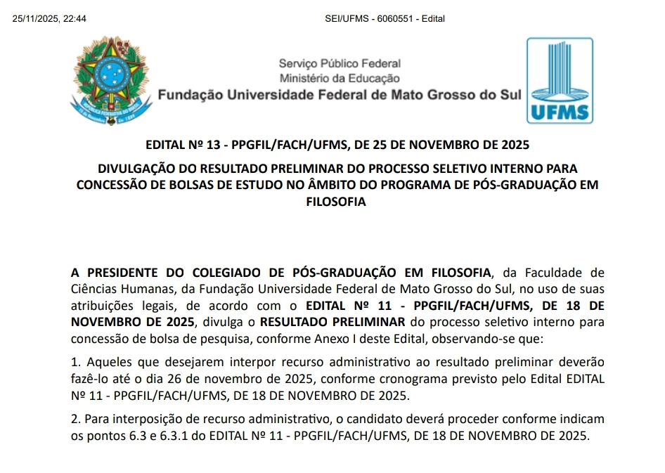 Foi publicado o Resultado Preliminar do Processo concessão de Bolsa de Pesquisa no Âmbito do Programa de Pós-Graduação em Filosofia.