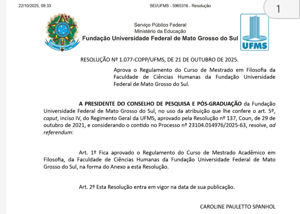 O Regulamento do PPgFil/UFMS foi aprovado pelo Conselho de Pesquisa e Pós-graduação da UFMS, por meio da Resolução Nº 1.077-COPP/UFMS, de 21 de outubro de 2025, publicada em 23/10/2025.